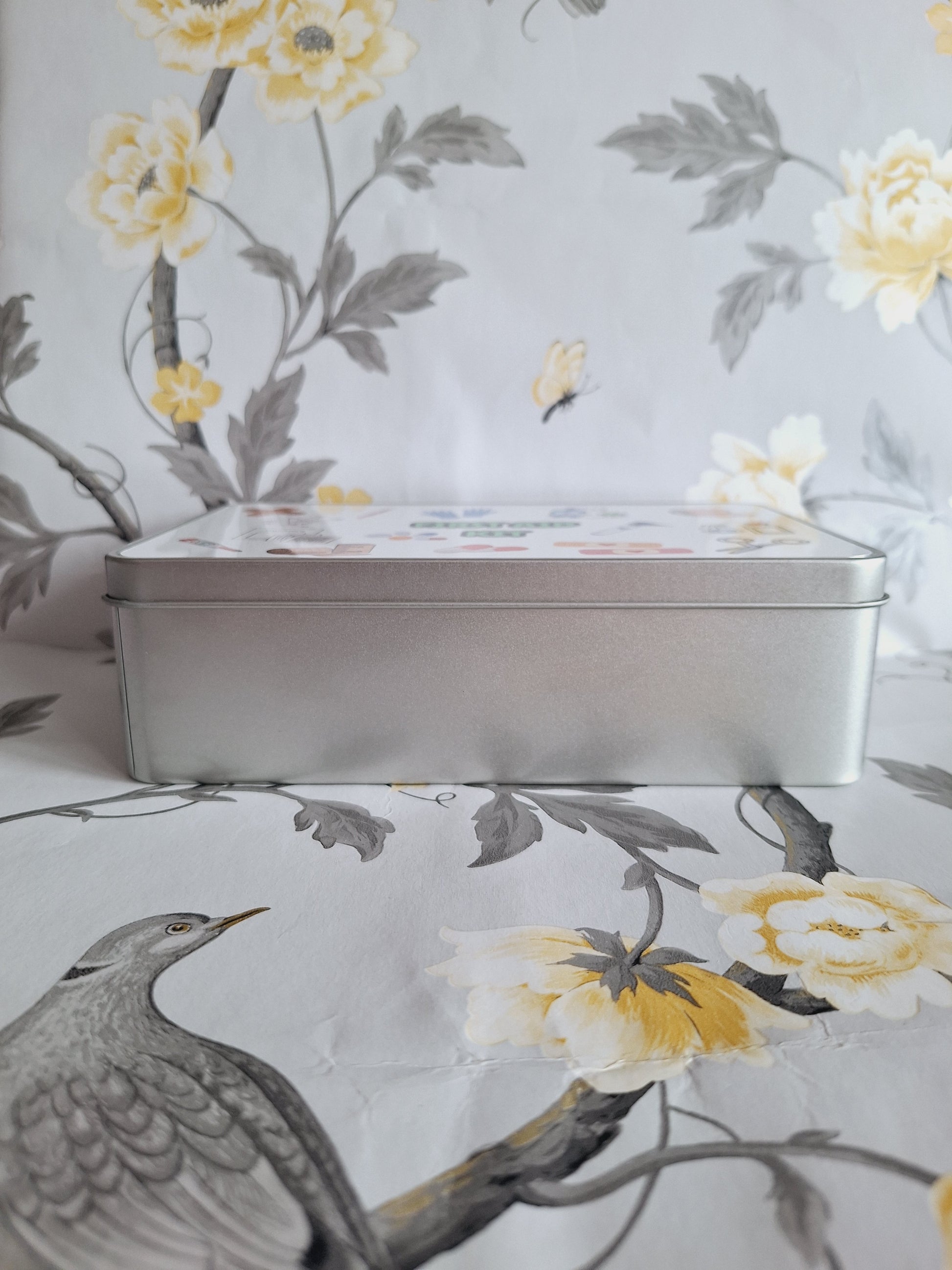 Silver metal tin measuring approximately 19.5cm x 12.5cm x 5cm