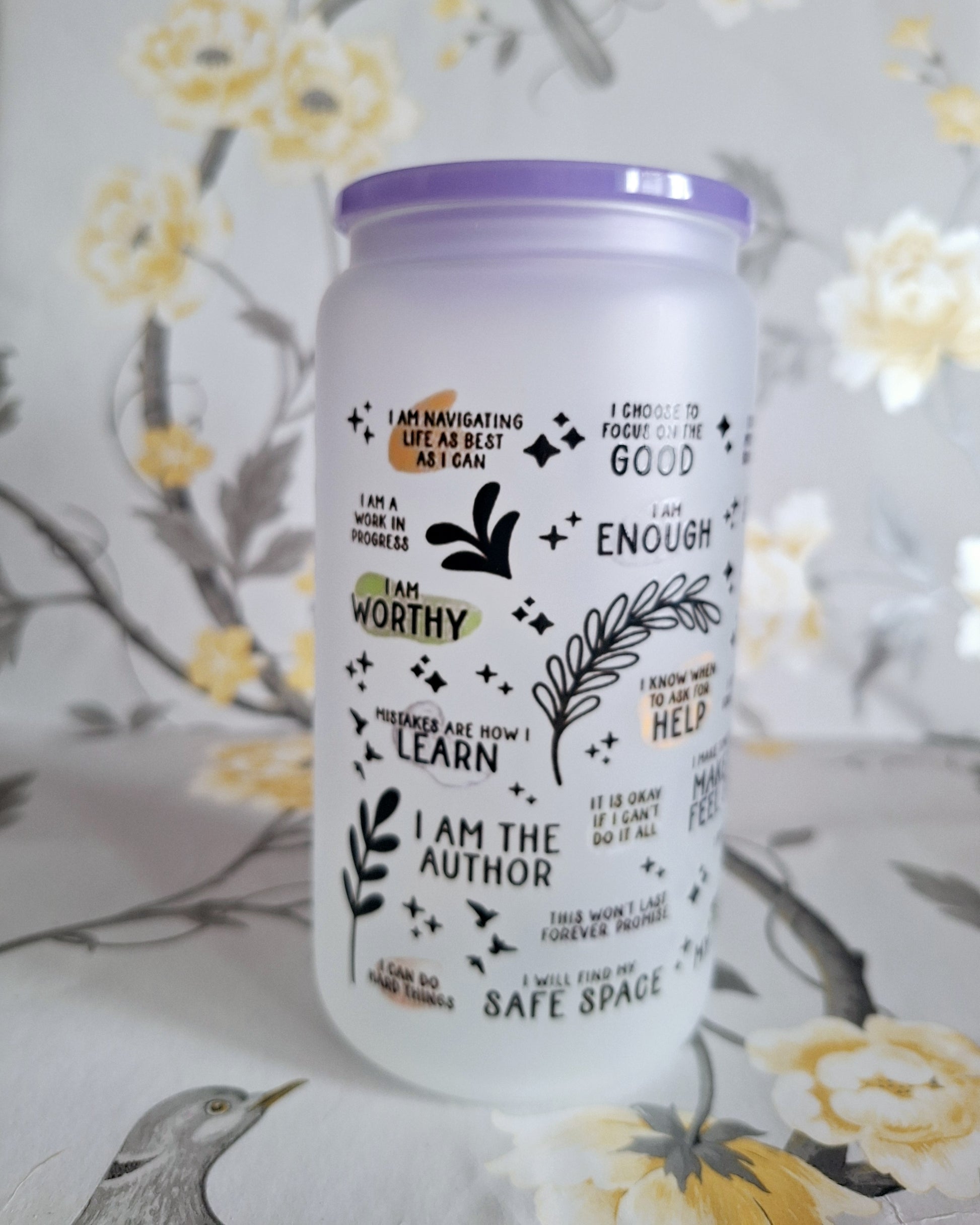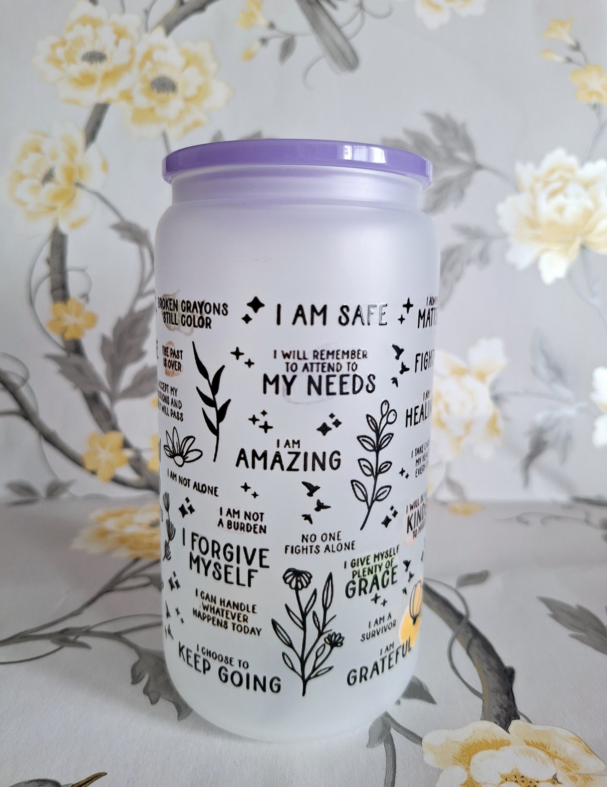 16oz glass tumbler with bamboo lid, comes with glass straw.